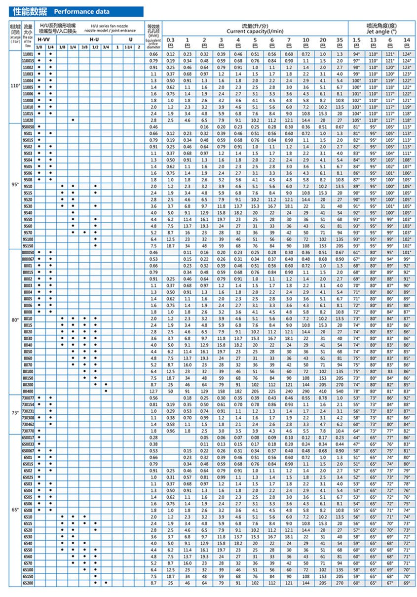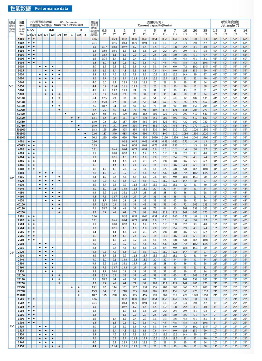 Application consulting: 139 1663 9930 Standard fan nozzles are divided into: Low flow rate 1/8-1/4 NPT or BSPT (M) Medium flow 1/8-3/4 NPT or BSPT (M) Large flow 1-2 NPT or BSPT (M) Design Features The characteristics of H/U series nozzles